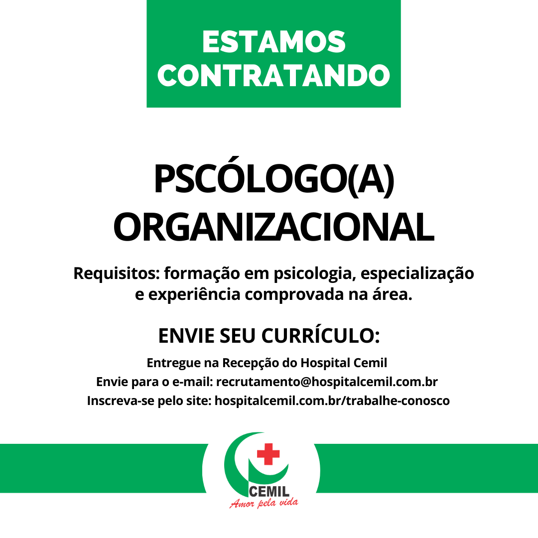 O Hospital Cemil, uma das principais referências em saúde na região de Umuarama, está com vaga aberta para o cargo de psicólogo(a) organizacional. A oportunidade é para contratação imediata e, além da formação em Psicologia, a instituição busca profissionais que tenham qualificações e experiência comprovada na área de psicologia organizacional.